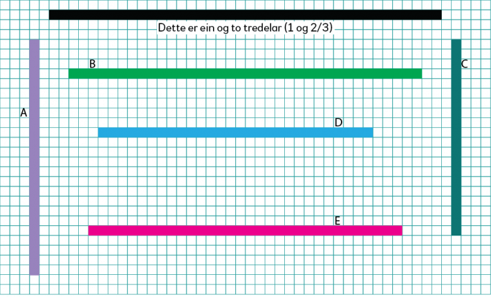 Vi ser på dei andre fargelagde stavane som brøkar av den svarte staven. Det vil seie at vi ser på dei som brøkar av \(1\frac23\).