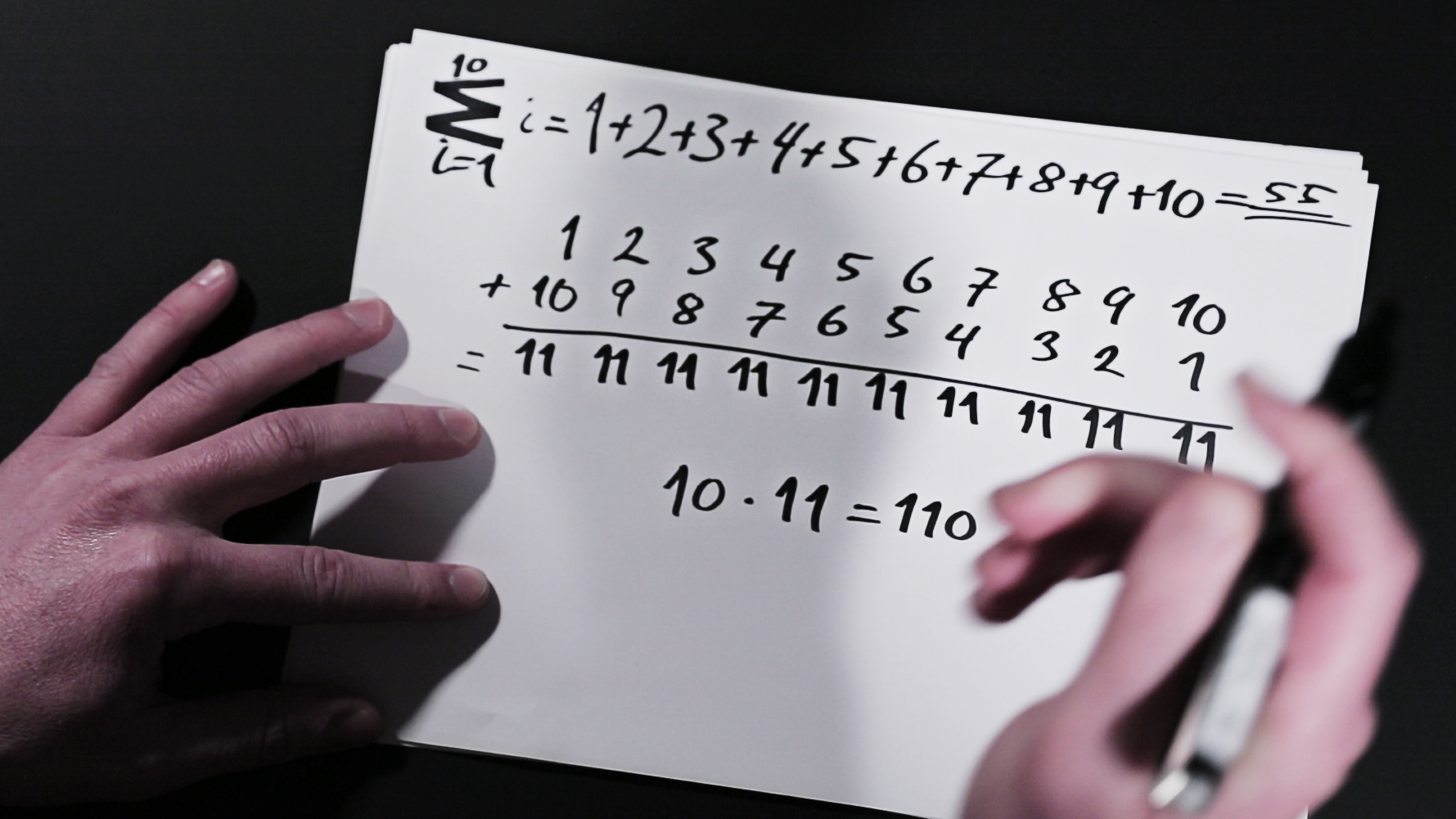 Du kan vise videoen der ein ser utrekninga av summen \(\displaystyle\sum_{i=1}^{10}i\), utan kommentarar. Eller du kan vise det same på tavla.