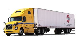 Bilde av et Volvo trekkvogn med tilhenger. Førerhuset er gult.